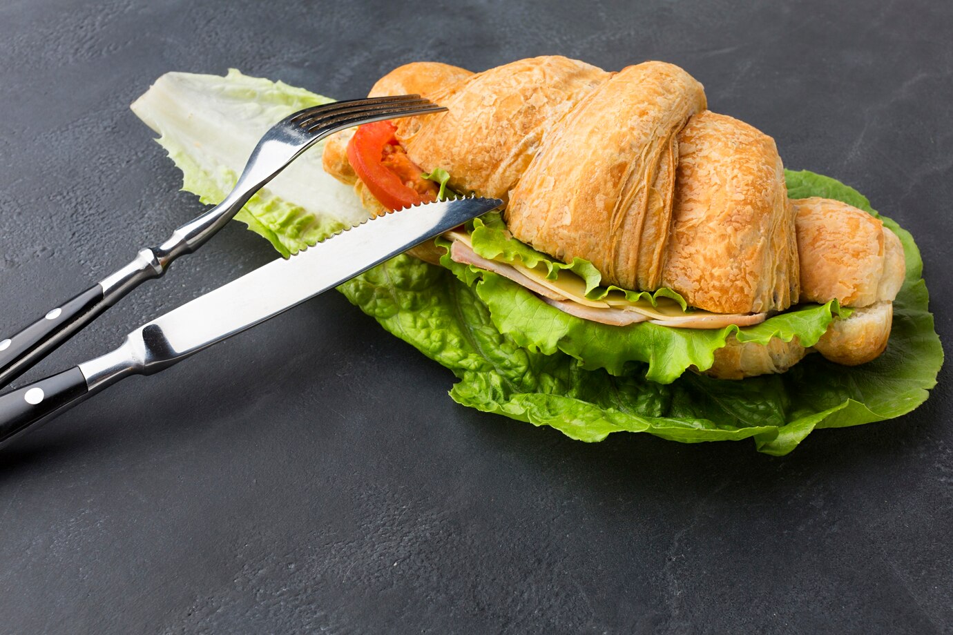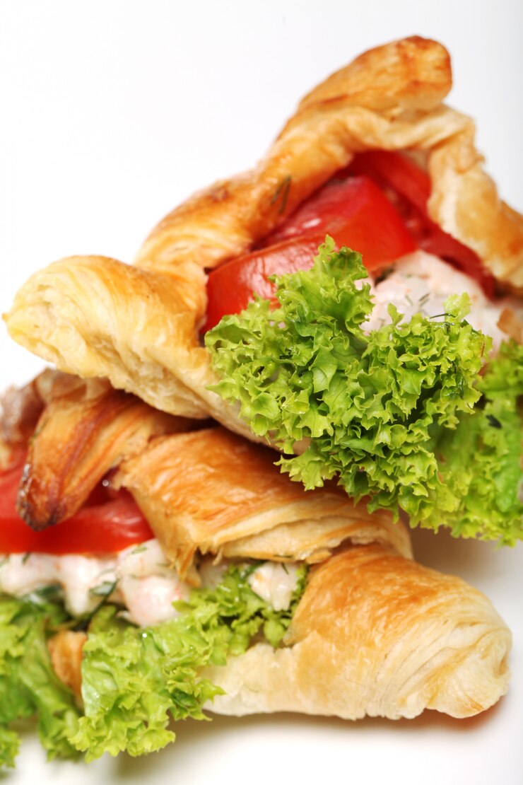 Сытный круассан с начинкой из салата, куриным филе, томатом и сыром пармезан.