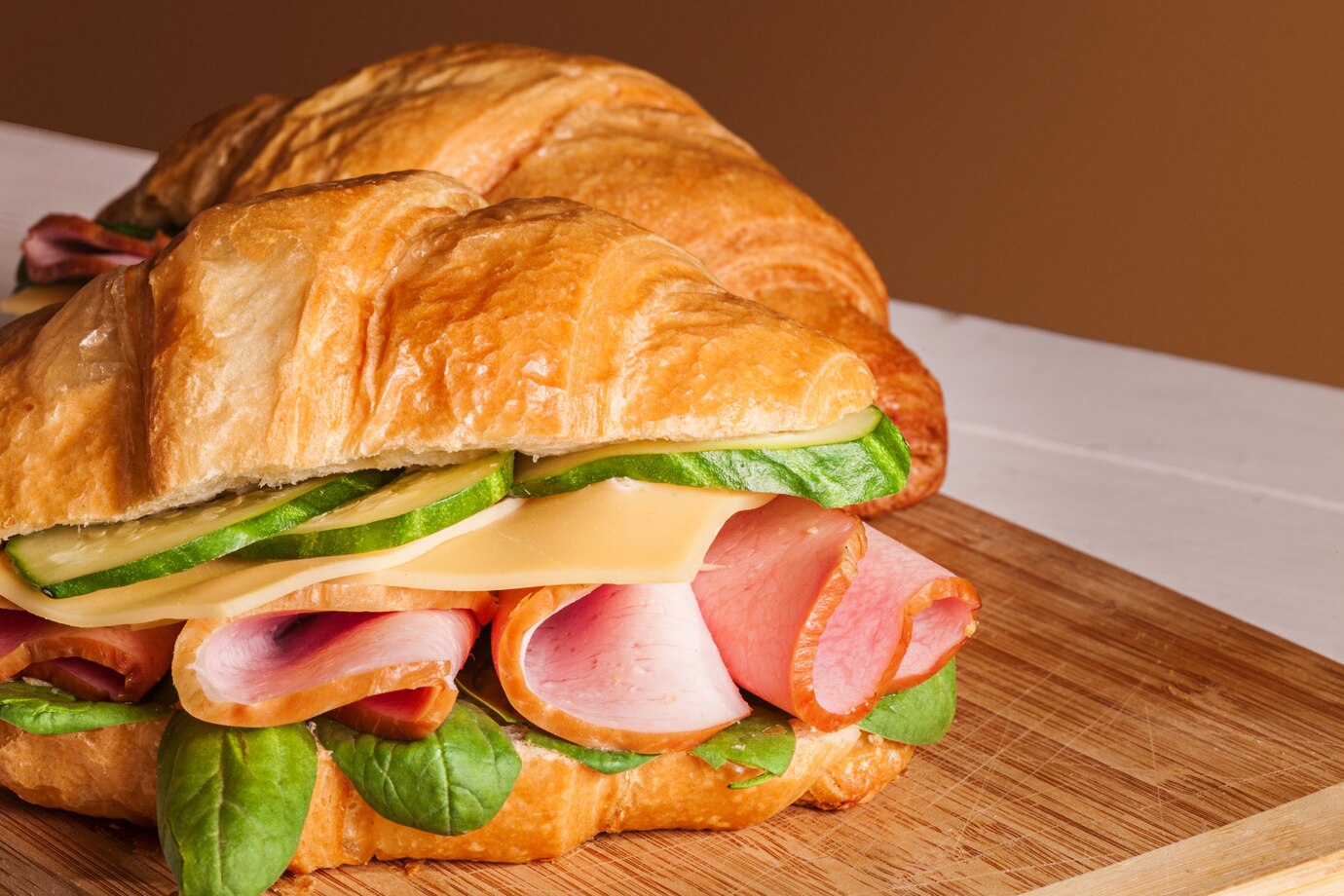 Нежный круассан с начинкой из салата, пармской ветчиной, свежим огурчиком и сыром.